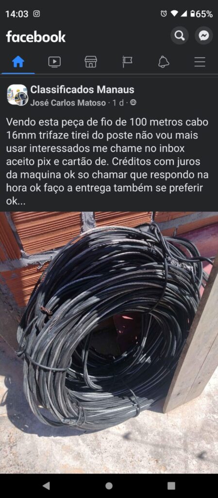 MANAUS (AM) – Na maior naturalidade e sinceridade, um homem identificado como José Carlos Matoso publicou no Facebook, no último sábado (25), um anúncio em um grupo de vendas de Manaus e região. Ele tentou vender 100 metros de fio de 16 milímetros que simplesmente foram furtados de um poste da cidade.