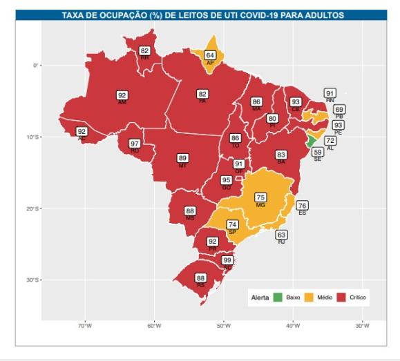 Aos 12 estados e Distrito Federal, que já se encontravam na zona de alerta crítica, somaram-se mais seis estados. Exceto pelo estado do Amapá (64%), que se mantém na zona de alerta intermediária, todos os estados da região Norte estão com taxas de ocupação de leitos de UTI Covid-19 para adultos superiores a 80%: