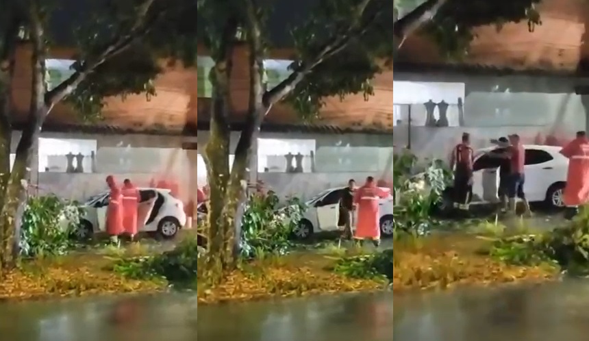 Os Bombeiros faziam o trabalho de corte de uma árvore que caiu após a chuva, quando o motorista disse que precisava passar pela rua. De forma desrespeitosa, ele tentou avançar por cima da árvore e colocou os trabalhadores em risco.