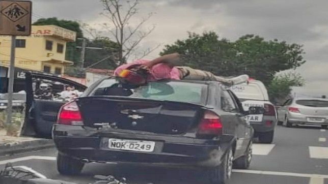MANAUS (AM) – Uma cena inusitada pôde ser vista na tarde desta quarta-feira (11) por quem passava pela avenida Autaz Mirim, no bairro São José, Zona Leste de Manaus. Um motociclista parou em cima do teto de um carro após acidente.