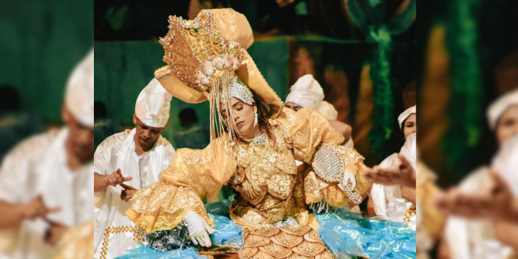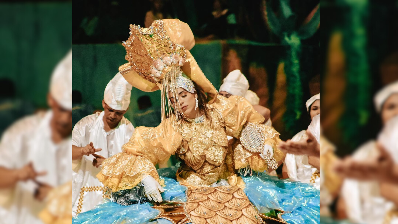 PARINTINS (AM) – Na segunda noite de apresentação no Festival Folclórico de Parintins, o boi-bumbá Caprichoso trouxe Valentina Cid, que defende o item de Sinhazinha da Fazenda, como a Orixá Oxum, que é uma entidade africana, preta.