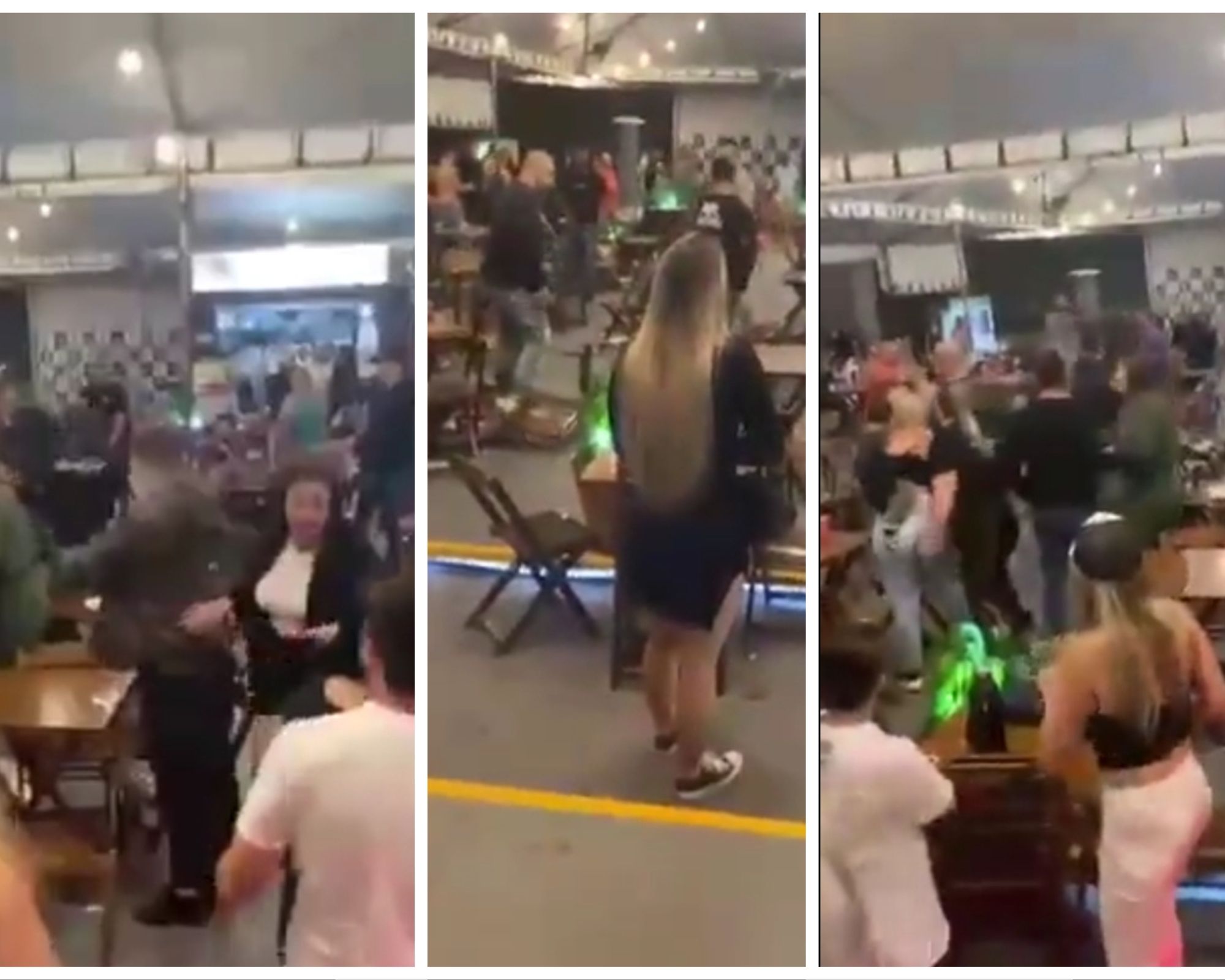 Nas imagens, é possível observar que a pancadaria começa no centro da praça e logo vai se espalhando por todo local. Cadeiras, garrafas e meses voam durante a briga e os seguranças se desesperam sem saber o que fazer.