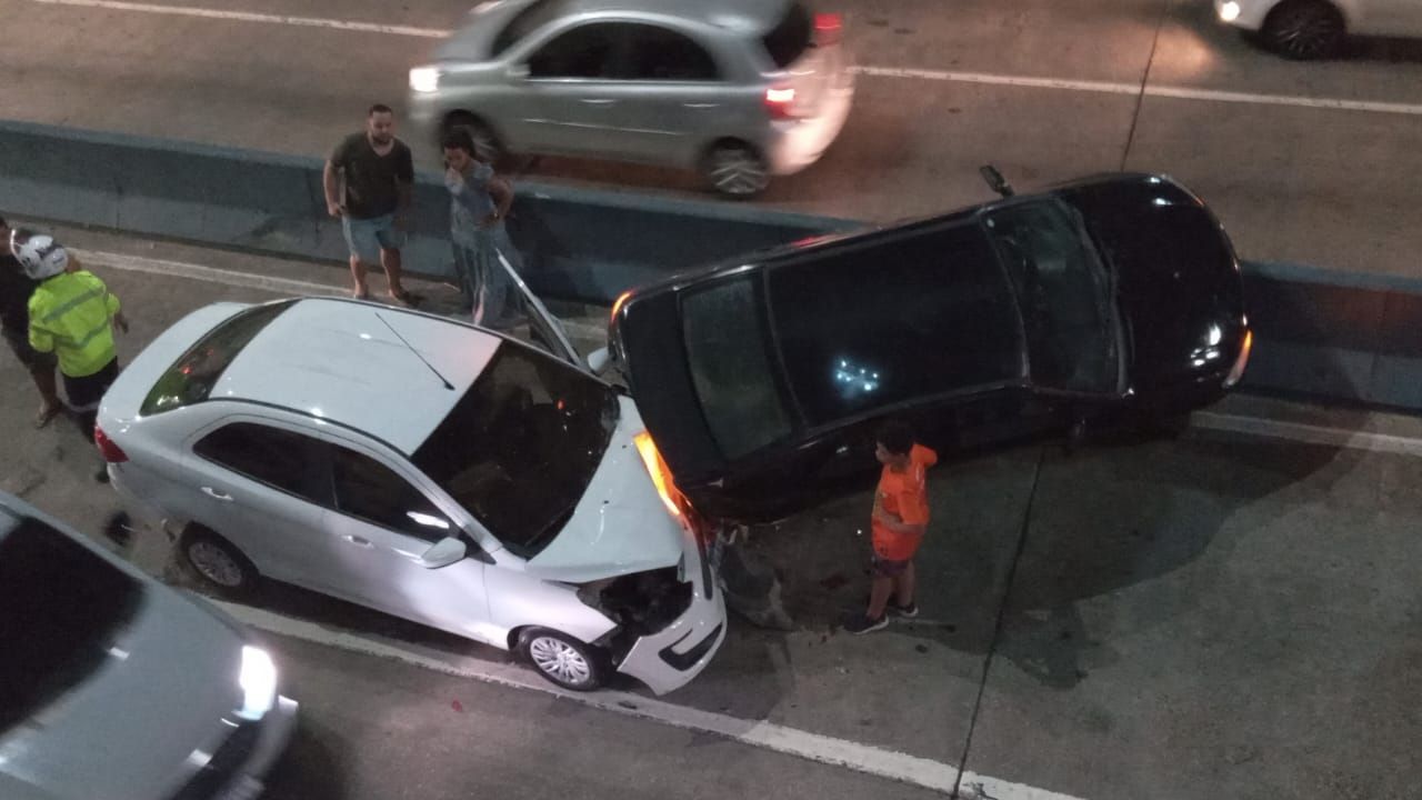 De acordo com informações, um motorista de aplicativo que estava em um Ford Ka Sedan, de cor branca, se abaixou após ouvir um som estranho vindo do veículo e acabou batendo em carro modelo Corsa Classic, de cor preta.