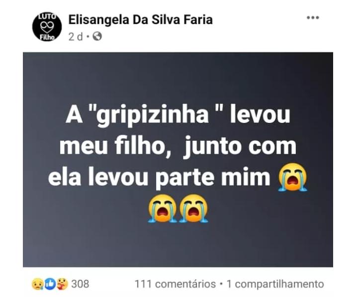 A mãe de Klediston, Elisangela da Silva Faria, desabafou em uma rede social. “A gripezinha levou meu filho, junto com ela levou uma parte de mim”.