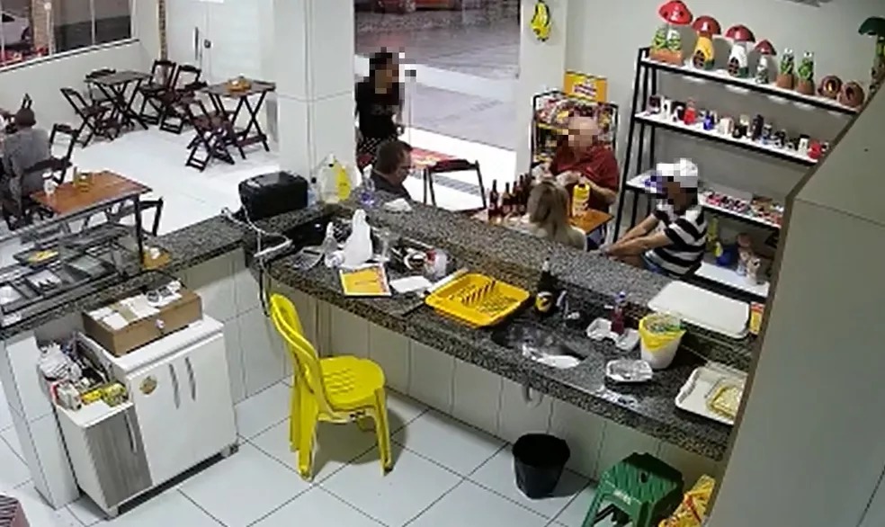 As imagens, gravadas no dia 16 de agosto, foram extraídas do circuito interno de vigilância e mostram o momento em que o homem comete o crime, na frente de outras pessoas que estavam no estabelecimento.