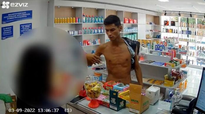 MANAUS (AM) – Câmeras de segurança da drogaria São Francisco, na avenida das Torres, Zona Norte de Manaus, filmaram o assalto que um homem não identificado cometeu neste sábado (3). Abusado, ele ainda agradeceu após levar vários produtos do local, dinheiro e ainda o celular da atendente.