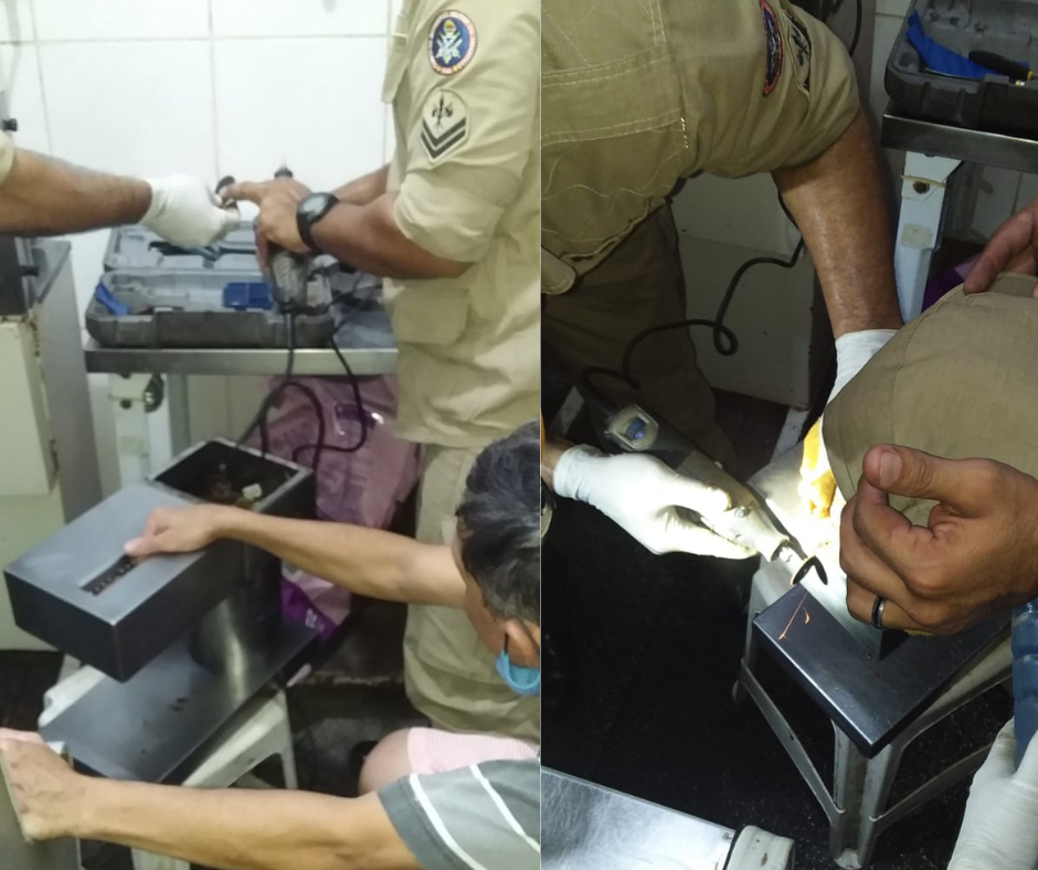 Utilizando a corda pedal do desencarcerador, um corta anel e chaves de fendas, os bombeiros retiraram a mão que estava presa.