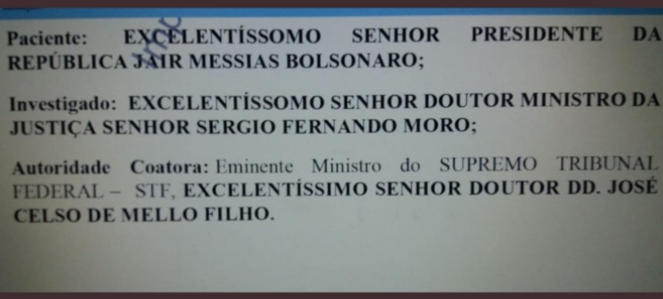 No pedido, ele ainda afirma que Sérgio Moro precisa ser investigado por “crimes contra a honra” do presidente. Reis Filho também pede a troca do ministro relator do Inquérito 4.831, que atualmente é o ministro Celso de Mello. O pedido do advogado será analisado por Mello