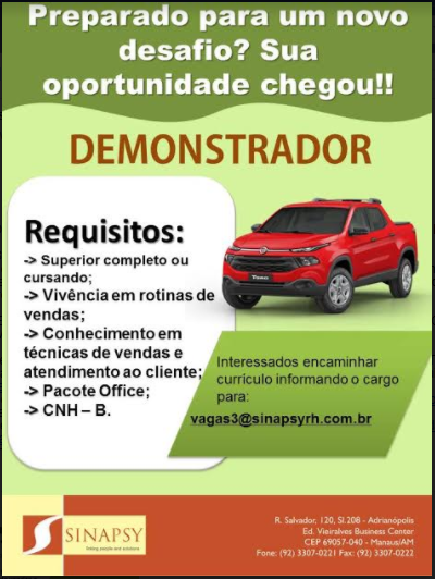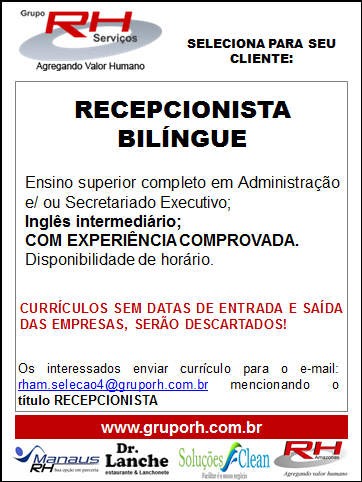Os candidatos que atenderem o perfil informado deverão encaminhar currículo com pretensão salarial para o e-mail: recrutarpessoas.am@gmail.com até dia 29/01/2018.