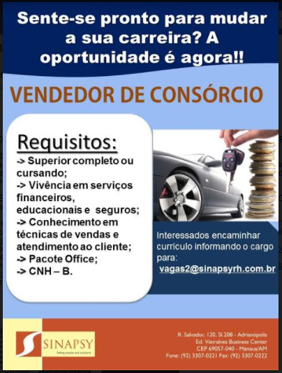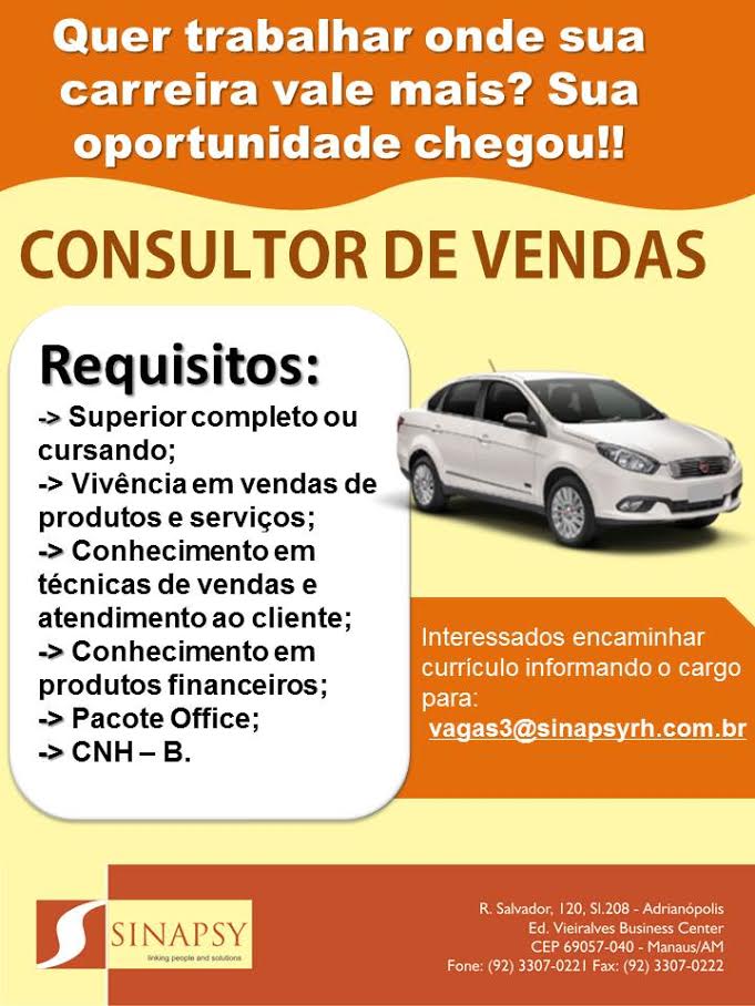 Interessados encaminhar currículo com o título da vaga no campo assunto, informando PRETENSÃO SALARIAL para: vagas2@sinapsyrh.com.br
