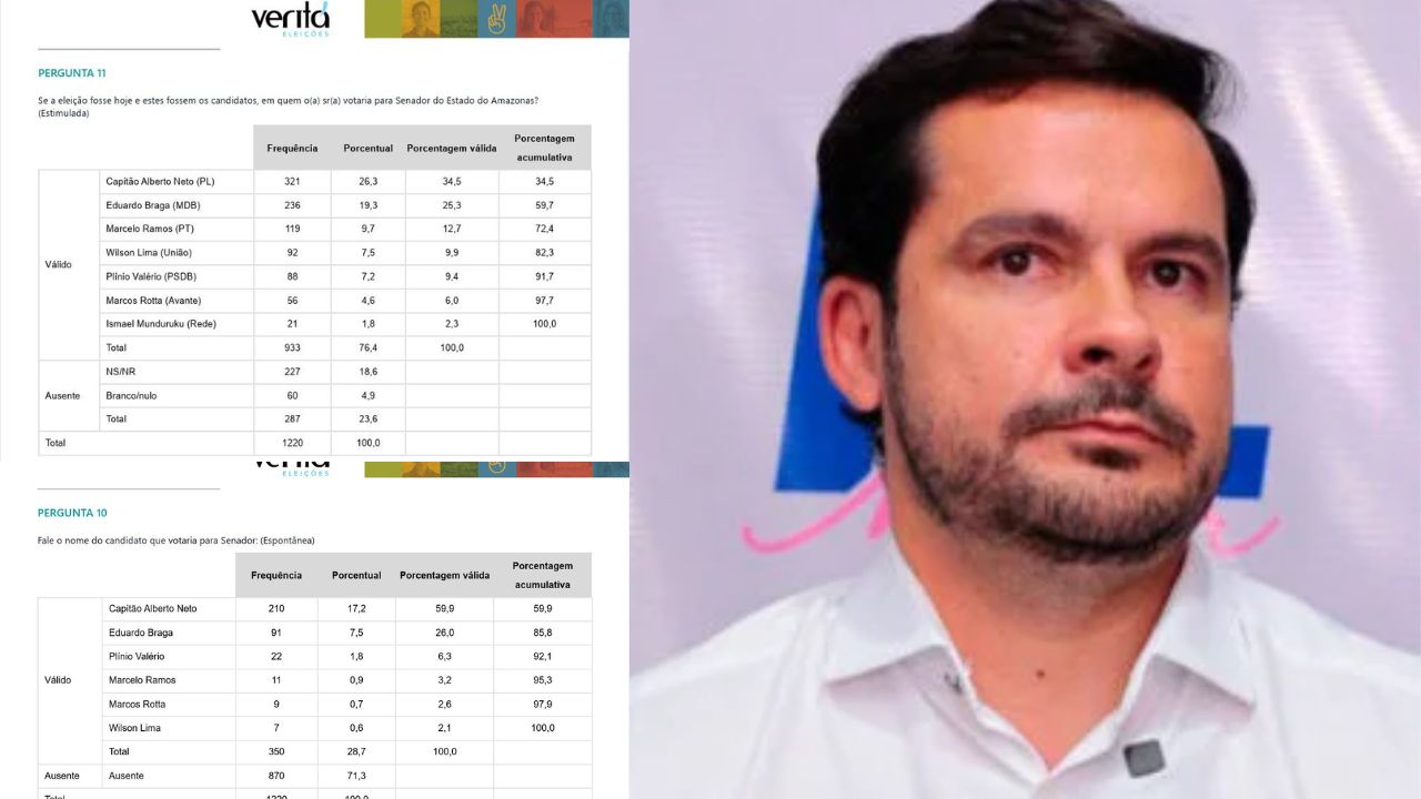 O levantamento, realizado pelo Instituto Veritá, entrevistou 1220 pessoas entre os dias 23 a 28/04/2026, é o quinto estudo eleitoral deste ano que confirma a preferência do eleitor amazonense pelo nome do deputado Capitão Alberto Neto como futuro Senador Federal pelo Amazonas.