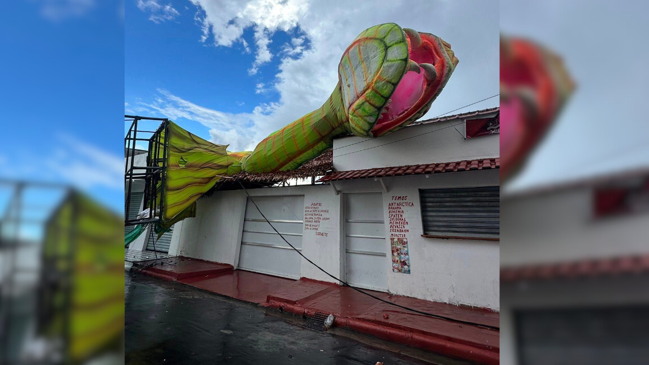 PARINTINS (AM) – Durante a chuva desta segunda-feira (10), parte de uma alegoria do Boi Garantido caiu sobre uma casa no município de Parintins, município do Amazonas.