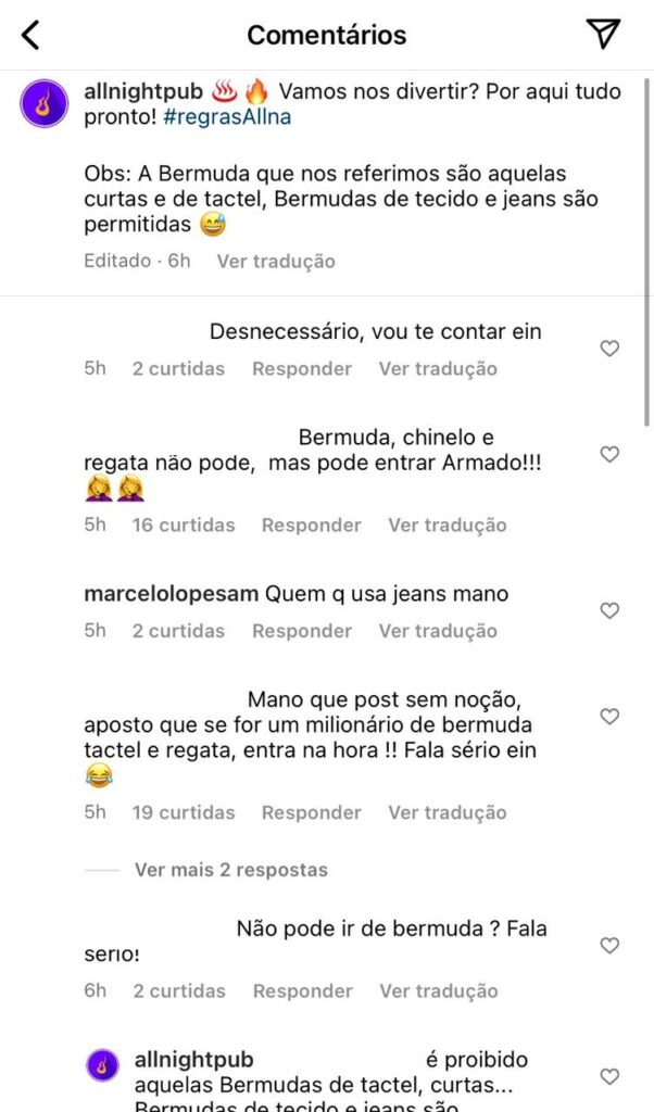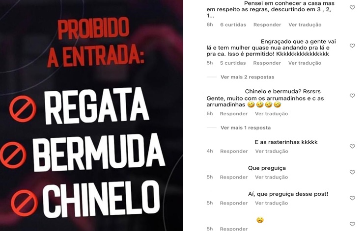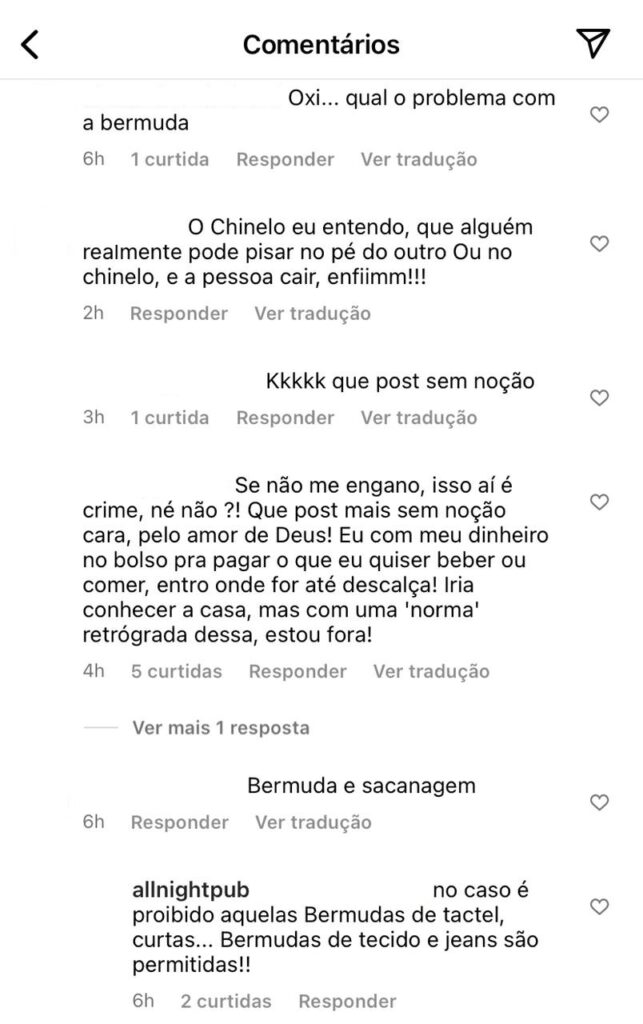 Na tarde desta sexta-feira (29), após a repercussão negativa, o All Night resolveu apagar a publicação. Houve muita reclamação. “Ai, que preguiça desse post”, disse uma seguidora. “Pensei em conhecer a casa, mas em regras, descurtindo em 3, 2, 1…”, falou outra pessoa. “Aposto que se for um milionário de bermuda tactel e regata, entra na hora”, disse outra.