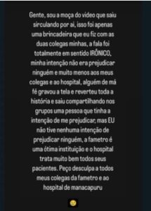 A estudante também se pronunciou e disse que tudo não passou de uma brincadeira e que sua intenção não era prejudicar ninguém.
