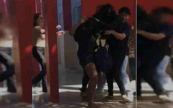 Nas imagens é possível ver o momento em que duas estudantes começaram a brigar e um outro aluno tenta separar as colegas. Em seguida, uma outra aluna e uma mulher chegam e começam a puxar o cabelo de uma das meninas.