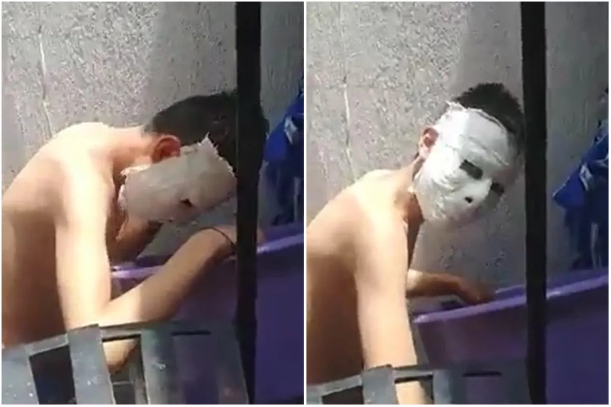 E é que o jovem teve que fazer uma máscara de gesso , atividade que ele cumpriu pela metade após o susto que aconteceu quando ela grudou no rosto.
