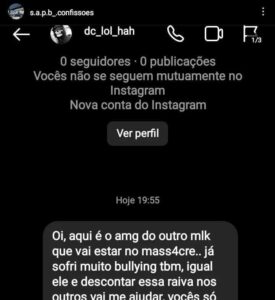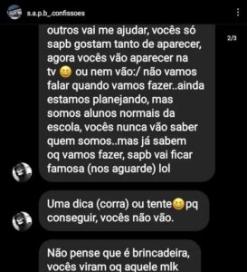 Os prints mostram fotos de armas e ligam as ameaças ao bullying.