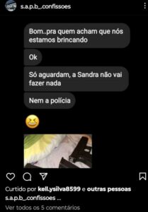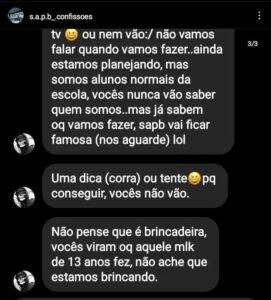 MANAUS – Mais uma escola do Amazonas nesta segunda-feira (3), é alvo de ameaças de alunos. Prints mostrados pelos estudantes aos pais, revelam ameaças de estudantes da escola municipal Sérgio Augusto Pará Bittencourt, localizada na rua Amor, bairro Novo Israel, Zona Norte. “Só aguardem. A Sandra não poder fazer nada e nem a polícia”.