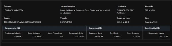 Mas, o que chama a atenção, é o salário que passou de R$ 3 mil para R$ 7 mil, chegando até R$ 131 mil bruto em um único mês por “outras vantagens” não descritas no portal. As vantagens parecem ser muitas, já que como atua no alto escalão, ele chegou a assinar documentos oficiais como “Diretor do Departamento de Planejamento”. Leís também viajou a Brasília junto do subsecretário, Junior Mar.