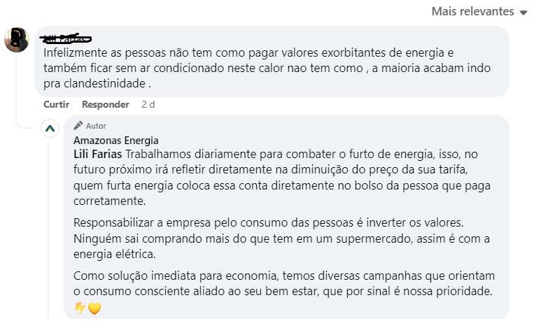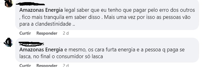 A consumidora apontou a mensagem e voltou a reclamar. “Legal saber que eu tenho que pagar pelo erro dos outros , fico mais tranquila em saber disso . Mais uma vez por isso as pessoas vão para a clandestinidade”, escreveu, seguida pelo protesto de outro consumidor. “Amazonas Energia e mesmo, os cara furta energia e a pessoa q paga se lasca, no final o consumidor só lasca”.