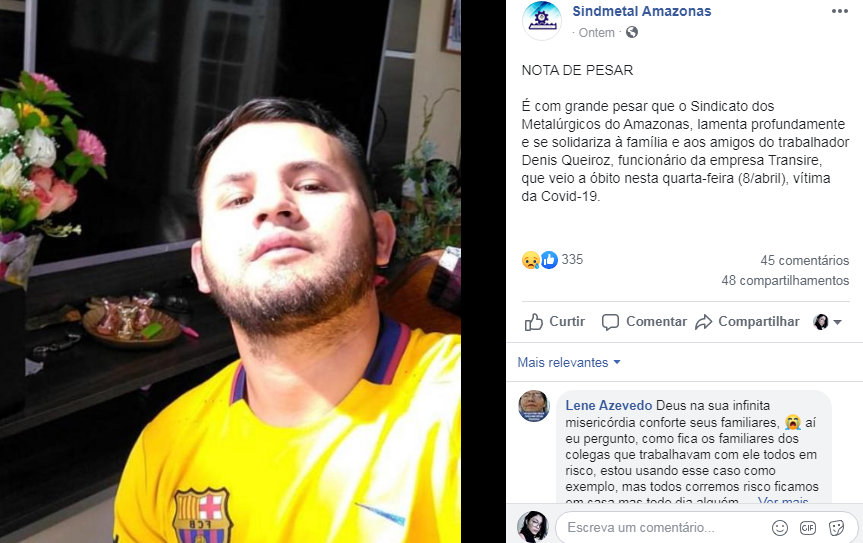 Uma da vítimas era Deniz Queiroz, colaborador da empresa Transire. O perfil da Sindmetal Amazonas postou uma nota de pesar para homenagear o funcionário: