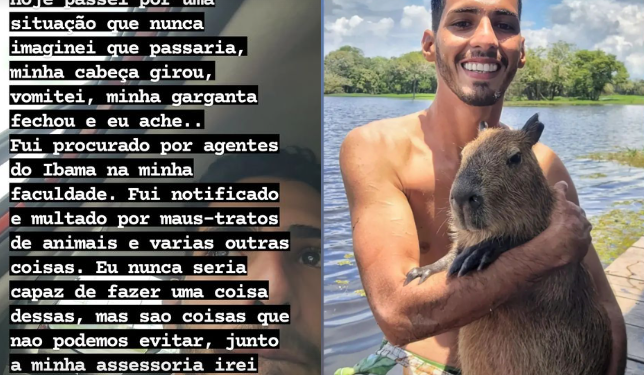 MANAUS (AM) – O amazonense Agenor Bruce Tupinambá, de 23 anos, estudante de Agronomia que viralizou na internet ao mostrar sua vida de ribeirinho com uma capivara de estimação, a Filó, de apenas 5 meses, contou nesta terça-feira (18) que foi multado em R$ 17 mil pelo Ibama. Segundo ele, a denúncia é de que o animal sofre maus-tratos.