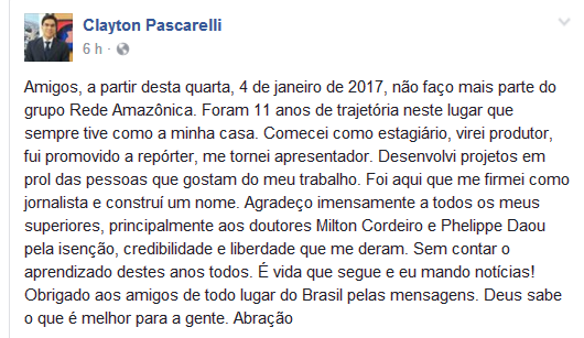 Manaus – Um dos maiores jornalistas da Tv amazonense, Clayton Pascarelli que comanda o telejornal ‘Bom dia Amazônia’ se desligou do grupo da filiada da Rede Globo no Amazonas.