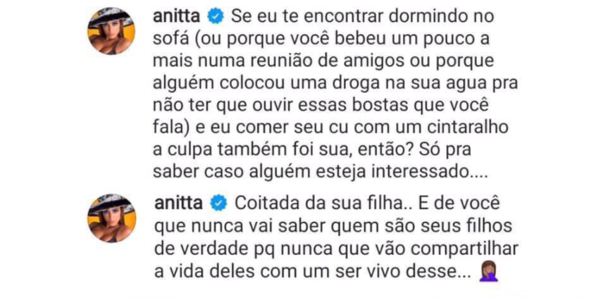 Anitta não ficou calada e foi uma das artista que detonou Constantino, e de uma forma um tanto didática, deu uma aula ao comunicador sobre seu ponto de vista totalmente errado sobre a cultura do estupro.