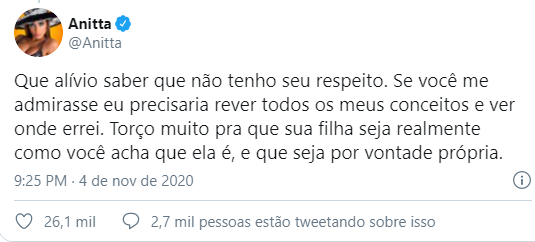 Rodrigo Rebateu as falas de Anitta e disse que não a respeita como mulher.