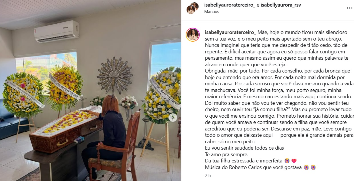 MANAUS – Isabelly Aurora postou uma foto ao lado do caixão da mãe, Isabel Cristina, nesta quarta-feira (9), em Manaus, e se despediu da genitora assassinada pelo padrasto nesta terça-feira (9), com requintes de crueldade.
