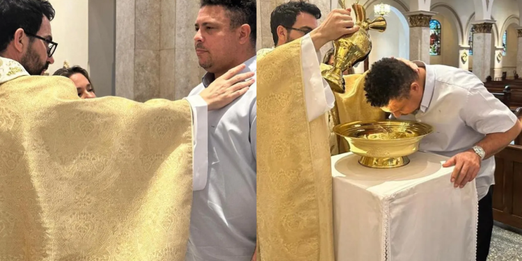 SÃO PAULO (SP) – Aos 46 anos, pela primeira vez Ronaldo Fenômeno foi batizado na igreja católica. O empresário e ex-jogador, compartilhou a cerimônia, que aconteceu nesta terça-feira (12), em seu Instagram, realizada pelo padre mais famoso do Brasil, Fábio de Melo.