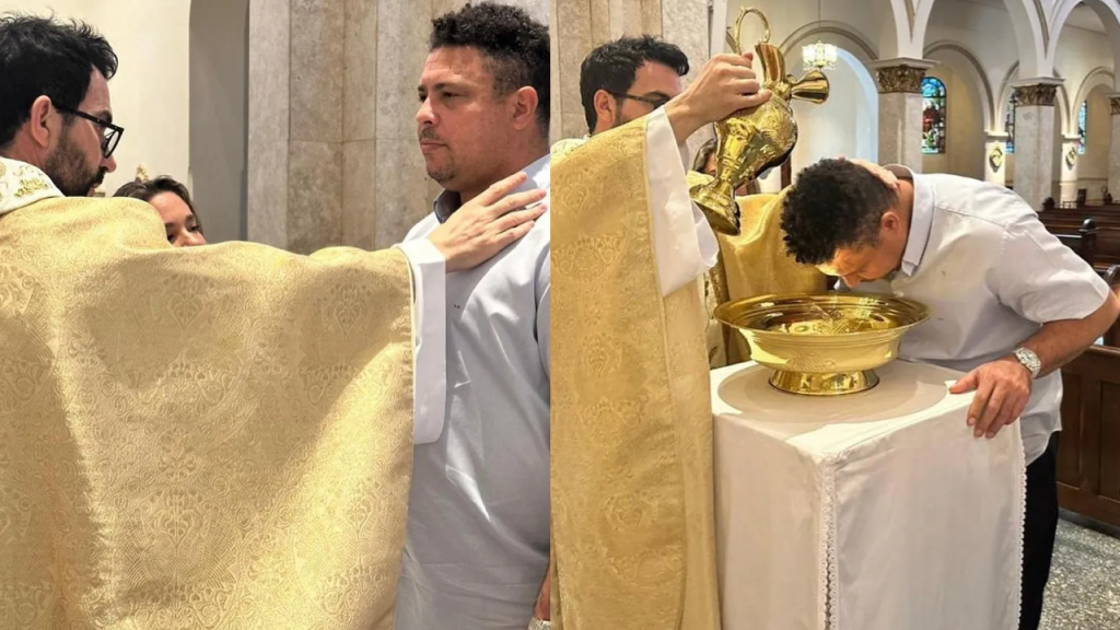 SÃO PAULO (SP) – Aos 46 anos, pela primeira vez Ronaldo Fenômeno foi batizado na igreja católica. O empresário e ex-jogador, compartilhou a cerimônia, que aconteceu nesta terça-feira (12), em seu Instagram, realizada pelo padre mais famoso do Brasil, Fábio de Melo.