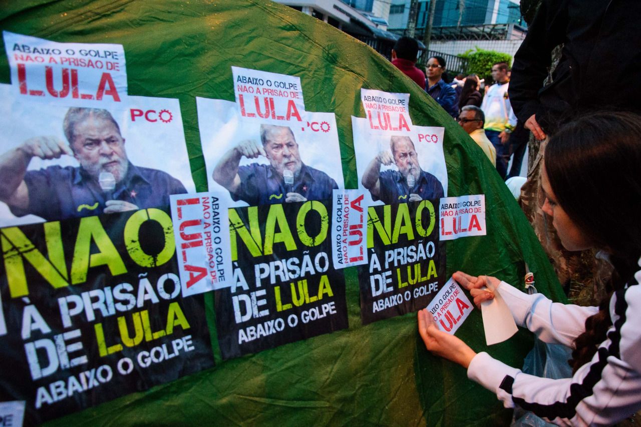 O grupo, que chegou na noite de domingo, colou cartazes em postes e lixeiras com os dizeres “Não à prisão de Lula” e gritavam “Lula, guerreiro do povo brasileiro”.