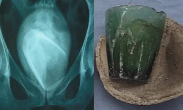 Aparentemente, ela inseriu o objeto na uretra, orifício pelo qual sai o xixi. Na publicação do caso, a revista médica ainda escaneou a imagem do copo de vidro envolto pela pedra na bexiga. No pronto-socorro, ela relatou que havia sofrido inflamação na bexiga várias vezes, mas nunca investigou.
