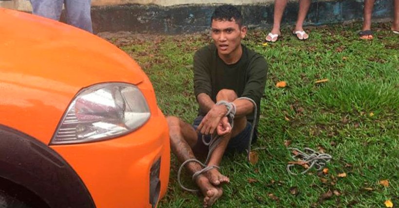 A jovem sem entender muito bem o que estava acontecendo, acabou levando vários empurrões do homem e foi agredida fisicamente por ele. Quando o criminoso conseguiu fugir, levando a bolsa e o aparelho celular da vítima, os moradores o perseguiram e conseguiram o prender com cordas, nas proximidades Terminal de Integração 4, na Zona Norte.