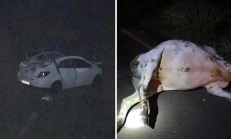 Segundo nota emitida pela PM, após atropelar a vaca, “o condutor perdeu o controle da direção, vindo a sair da pista pelo lado esquerdo, caindo em uma ribanceira, chocando com a cerca de arame e repousando fora da via”
