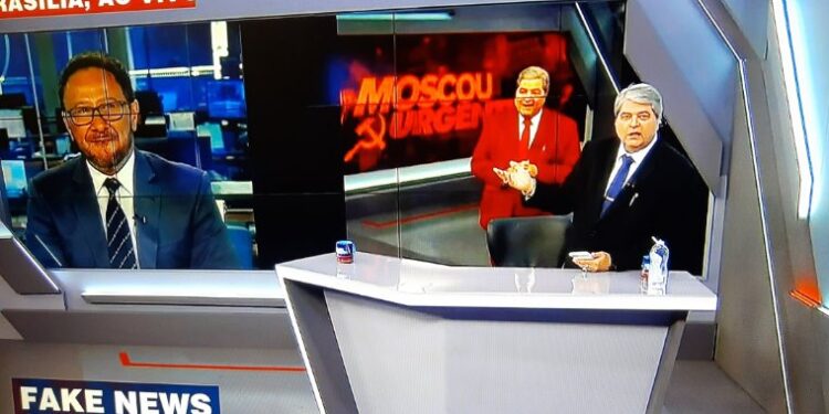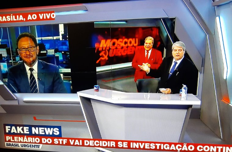 A imagem mostra o apresentador vestido de vermelho e o nome do programa foi trocado para “Moscou Urgente”, também vermelho, com os símbolos de um foice e um martelo, representação do comunismo.