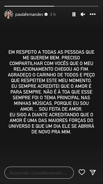 “Em respeito a todas as pessoas que me querem bem, preciso compartilhar com vocês que o meu relacionamento chegou ao fim. Agradeço o carinho de todos e peço que respeitem este meu momento”, pediu ela no começo do texto.