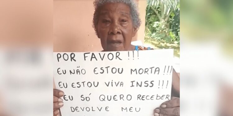 Em um vídeo compartilhado nas redes sociais, a idosa apareceu segurando um cartaz escrito: “Por favor!!!! Eu não estou morta!!! Eu estou viva INSS!!! Eu só quero receber, devolve meu pagamento”.