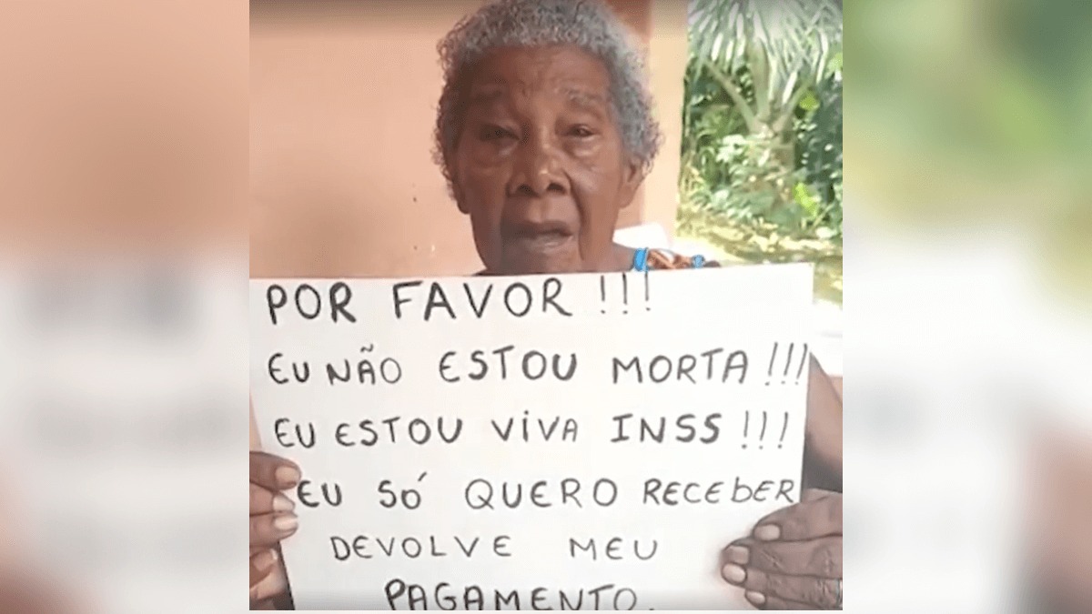 Em um vídeo compartilhado nas redes sociais, a idosa apareceu segurando um cartaz escrito: “Por favor!!!! Eu não estou morta!!! Eu estou viva INSS!!! Eu só quero receber, devolve meu pagamento”.
