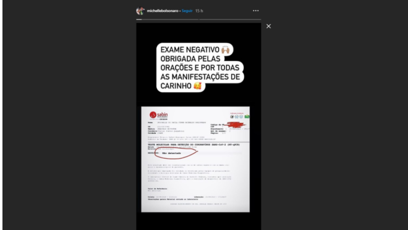 A primeira dama compartilhou uma foto com o resultado e comemorou dizendo: “Exame negativo. Obrigada pelas orações e por todas as manifestações de carinho”, escreveu ela.