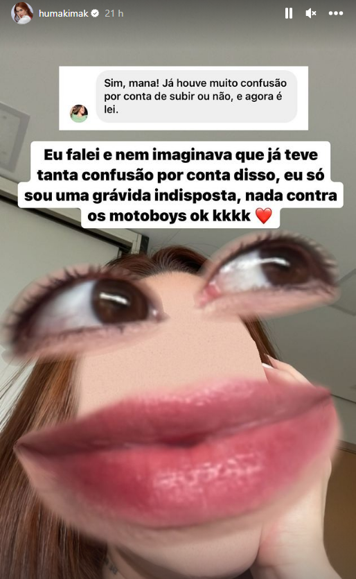 A blogueira chegou a usar a gravidez para justificar a cena, mas viu que muita gente foi contra e respondeu nos stories dela que a gravidez não lhe dá o direito de humilhar trabalhadores. “Já é a segunda vez que eu peço e o motoboy fala que não vai subir”.