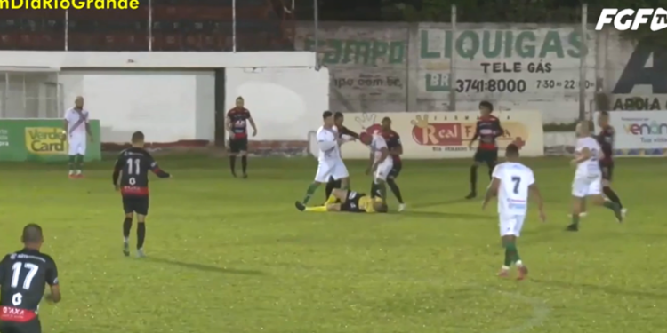 O juiz fica imóvel após sofrer a agressão, e jogadores das duas equipes imediatamente chamam atendimento médico.