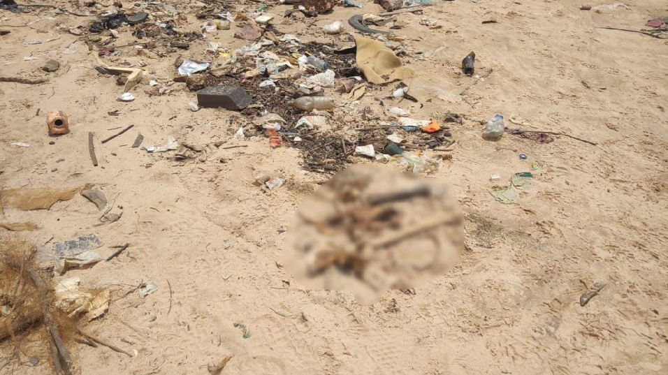 Segundo policiais militares, uma arcada dentária e outros ossos foram encontrados na areia e estavam junto com o acumulado de lixo deixado pela vazante.