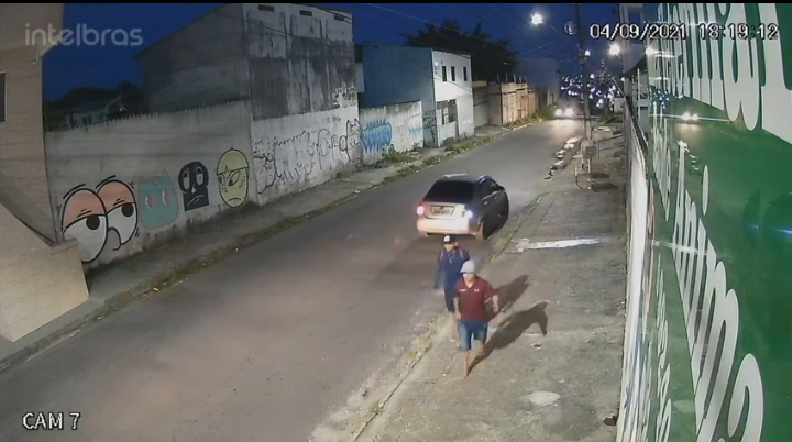Câmeras de segurança próximas ao local mostram o momento em que os bandidos tentam atirar na mulher, mas visivelmente a arma falha e o marido da vítima arranca com o carro, enquanto a mãe da mulher protege as crianças dos possíveis tiros.