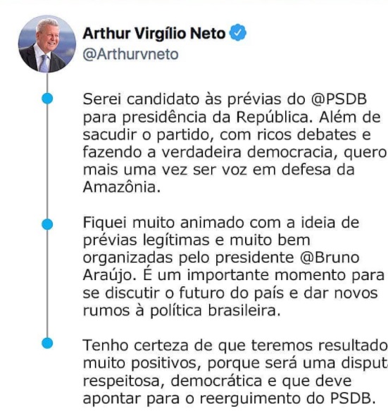 Apesar do desejo, antes de encarar Jair Bolsonaro e até possivelmente Lula, o político amazonense terá de vencer João Dória, nome mais cotado pelo partido para ser o represetnante O nome de Arthur aparece cotado para a disputa pelo governo do Amazonas, mas antes o sangue político ferve pelas prévias nacionais do PSDB. “Jamais me furtaria a um processo democrático. Minha essência é de luta, é de encarar desafios de frente. Depois de muito tempo, o PSDB realizará prévias, amplas e legítimas. Não ficaria de fora desse momento. E, assim como fiz no meu primeiro discurso como deputado federal, em 1983, levantarei a bandeira do meio ambiente, do desenvolvimento sustentável e da Amazônia.”