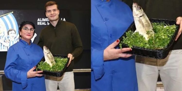 O artilheiro fez uma parceria com um supermercado local, e ganhou uma travessa com um peixe fresco, para preparar da maneira que preferisse.