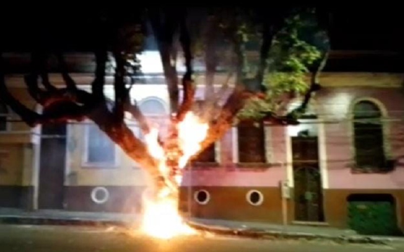 MANAUS (AM) – Um oitizeiro (Licania tomentosa) de mais de 100 anos localizado na Rua Ferreira Pena, no Centro de Manaus, foi incendiado na noite desta segunda-feira (24). Segundo dois guardadores de carro, o fogo começou em um papel deixado ao pé da árvore.