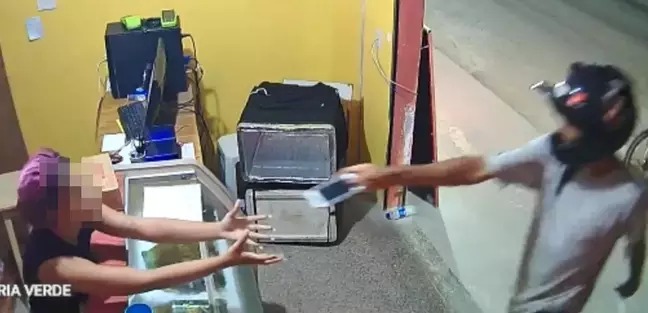 O autor do crime chegou com um comparsa em uma moto. Ele não tirou o capacete e estava carregando uma pistola quando entrou no local. O roubo foi flagrado pelas câmeras de segurança do local. O ladrão chega a apontar o revólver para a funcionária, então, devolve o celular.