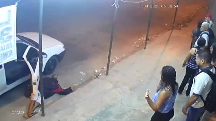 Na sequência, um carro se aproxima do local e, ao tentar entrar no veículo, o criminoso desmaia. Um dos comparsas ainda puxa o rapaz para dentro, mas ele cai duas vezes. Imagens da câmera de segurança do local mostram o momento em que o homem cai no chão, no momento em que tentava entrar no veículo para fugir.